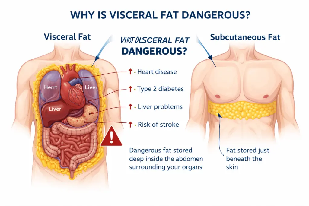 Visceral fat is the fat that surrounds your internal organs your liver, pancreas, and intestines. Unlike subcutaneous fat (the fat you can pinch under your skin), visceral fat is metabolically active and directly drives insulin resistance, inflammation, and cardiovascular disease. Consequently, a high visceral fat level is one of the strongest predictors of Type 2 diabetes, fatty liver disease, and heart disease.