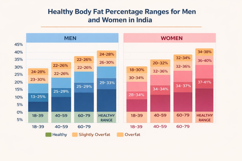 Furthermore, the healthy range for body fat percentage differs between men and women, and between Indian and Western populations. InBody applies population-specific reference ranges — which is especially important for Indian patients.