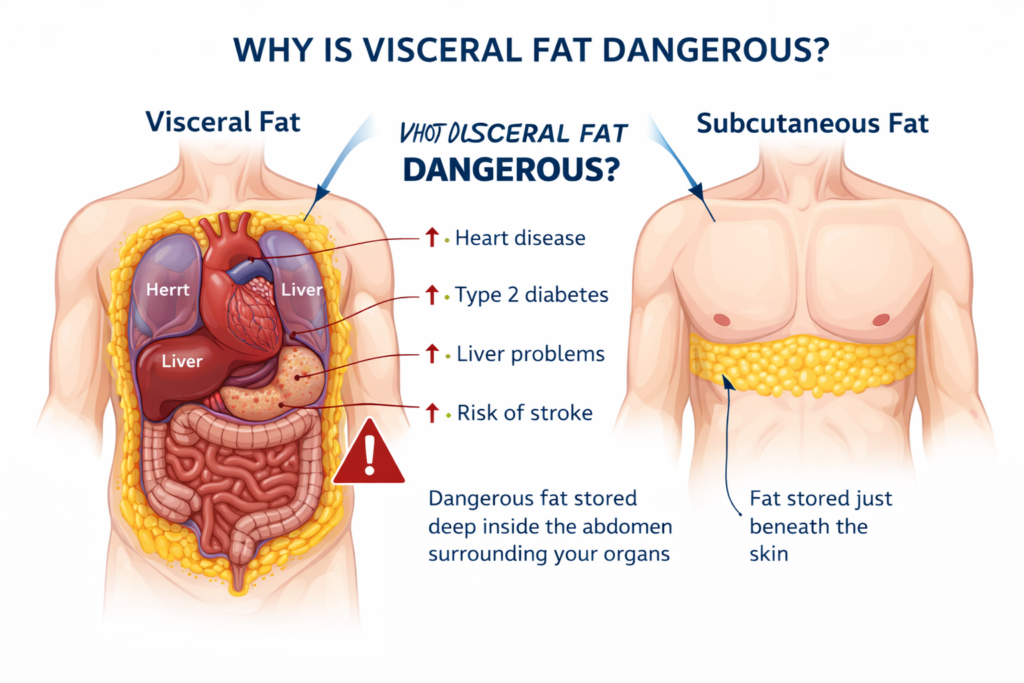 Visceral fat is the fat that surrounds your internal organs — your liver, pancreas, and intestines. Unlike subcutaneous fat (the fat you can pinch under your skin), visceral fat is metabolically active and directly drives insulin resistance, inflammation, and cardiovascular disease. Consequently, a high visceral fat level is one of the strongest predictors of Type 2 diabetes, fatty liver disease, and heart disease.
