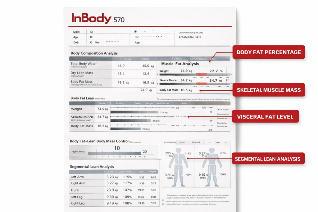 Instead of relying on BMI, body composition analysis gives you a full, detailed picture of what your body is made of. Specifically, InBody measures five key markers that BMI completely ignores. Each one tells a different, critical part of your fitness story.