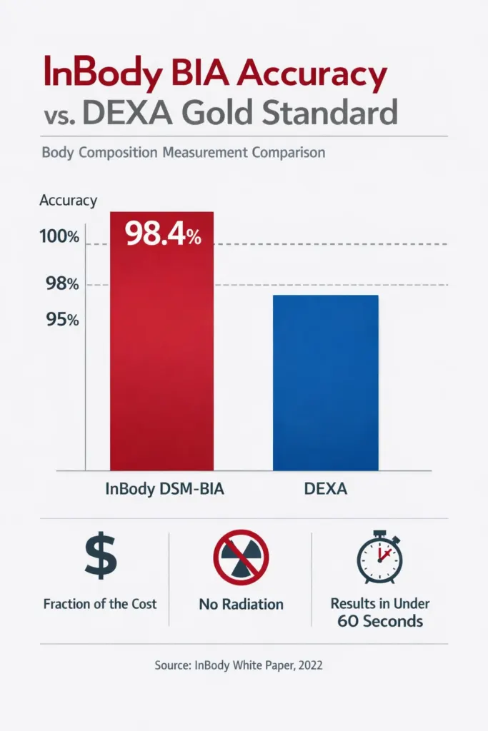 - InBody achieves 98.4% accuracy vs DEXA with no radiation, in under 60 seconds, at a fraction of DEXA’s cost, making it the practical standard for routine body composition monitoring.