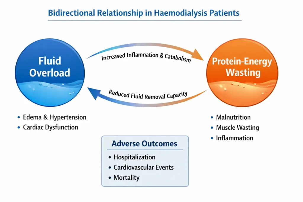 Fluid overload and malnutrition are not independent problems in dialysis patients; they are deeply intertwined. A 2023 Scientific Reports study confirmed that an elevated ECW/TBW ratio in haemodialysis patients is independently associated with protein-energy wasting (PEW), lower serum albumin, lower normalised protein catabolic rate (nPCR), and lower serum creatinine. This means that a dialysis patient who is both malnourished and overhydrated will have a severely elevated cardiovascular mortality risk that is substantially higher than either problem alone.