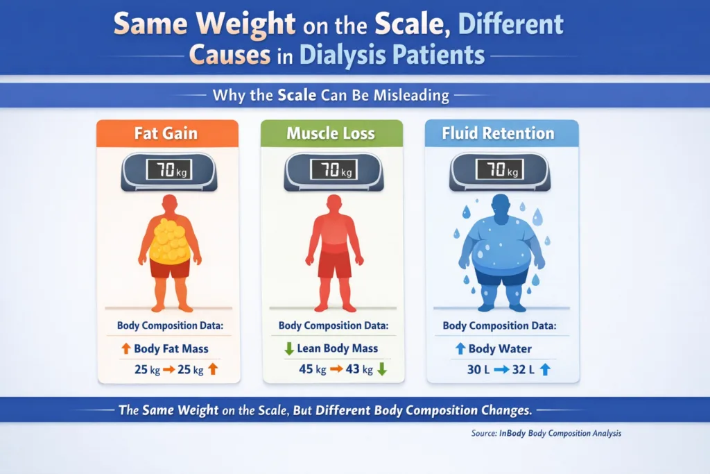 A dialysis patient who gains 2 kg of adipose tissue over 6 months while losing 1.5 kg of skeletal muscle, common in dialysis-related sarcopenia, may appear at their dry weight by scale measurement while carrying significant hidden fluid overload. Their weight has changed, body composition has deteriorated. Their dry weight target is wrong. And without direct body composition measurement, no one knows.