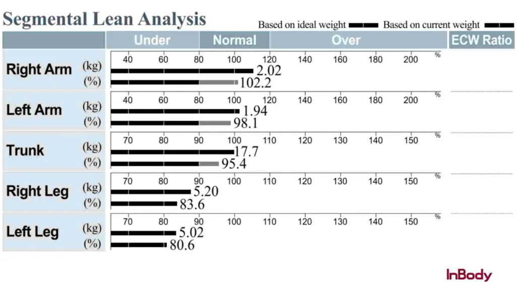 | 5 | Segmental Lean Analysis | Muscle mass per limb and trunk reveals imbalances and deficits | ≥0.2 kg asymmetry = injury risk; leg deficit = fall risk and glucose disposal impairment | All models |
