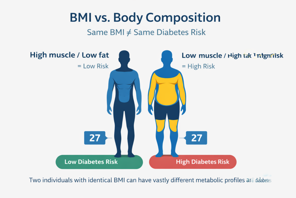Traditional diabetes risk assessment relies on fasting glucose, HbA1c, BMI, and family history. These are valuable but incomplete. BMI, for example, cannot distinguish between muscle mass and fat mass; a highly muscular athlete and a sedentary individual with 40% body fat can share the same BMI.