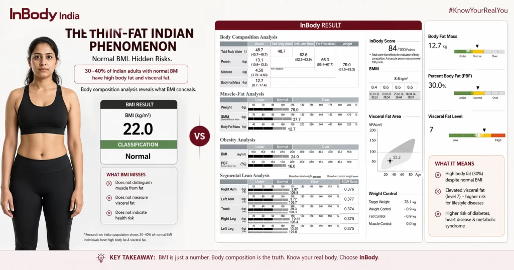 | Slim Indian adult, sedentary lifestyle | Normal | High body fat, low muscle, elevated visceral fat MONW | BMI misses significant metabolic risk |