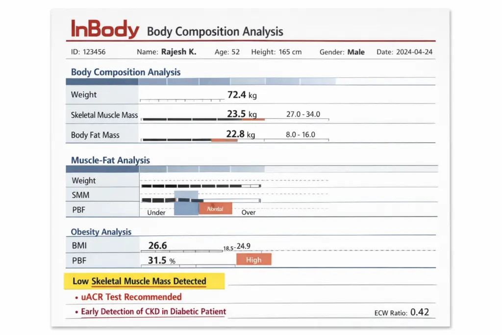 - Sarcopenic obesity, high fat and low muscle at a “healthy” BMI, is disproportionately prevalent in Indian patients. The 2025 Indian Consensus on Sarcopenia shows that Asian Indians with type 2 diabetes have a six-fold higher risk of low muscle mass.