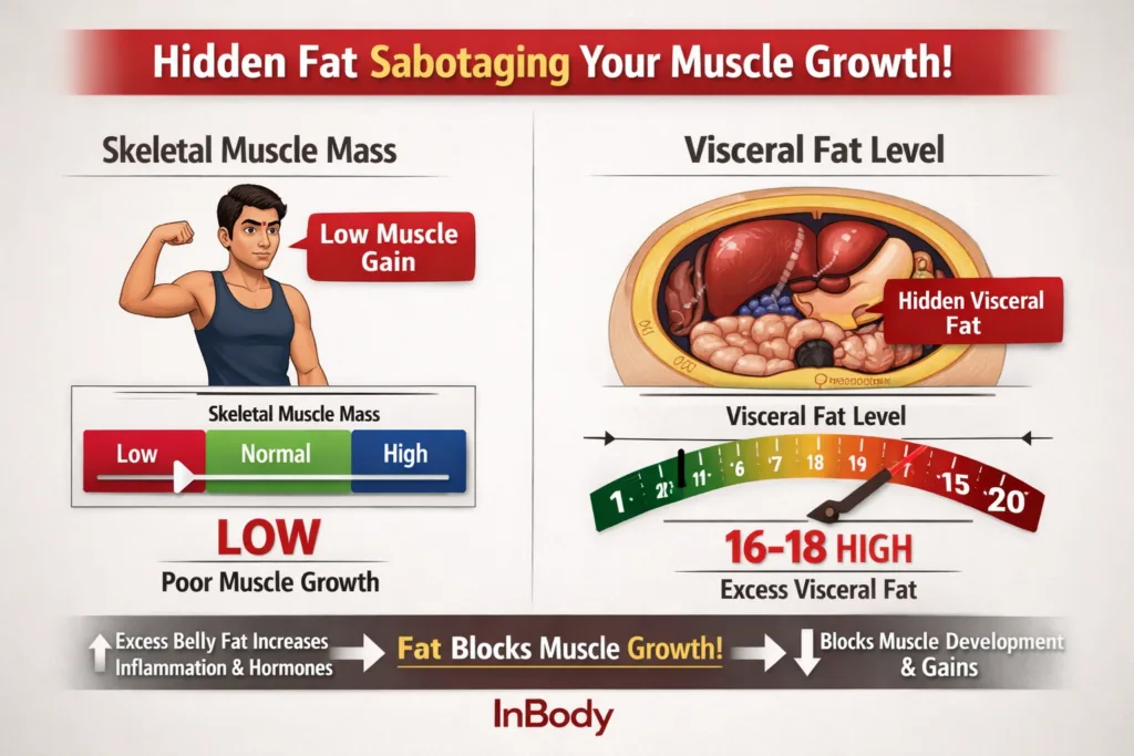 If visceral fat is elevated, muscle-building is fighting an active biochemical adversary, not a neutral environment. A person with high visceral fat trains in a chronic inflammatory state. This environment suppresses muscle-building signals. InBody helps identify this and sets a clear target: reduce visceral fat first.