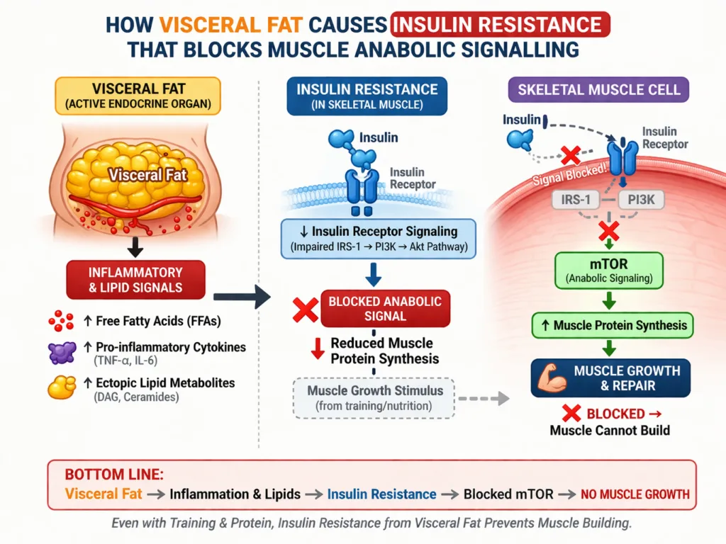 Visceral fat disrupts major anabolic hormones. These include growth hormone, testosterone, and IGF-1. Each disruption independently impairs muscle protein synthesis, muscle satellite cell activation, and muscle fibre hypertrophy.
