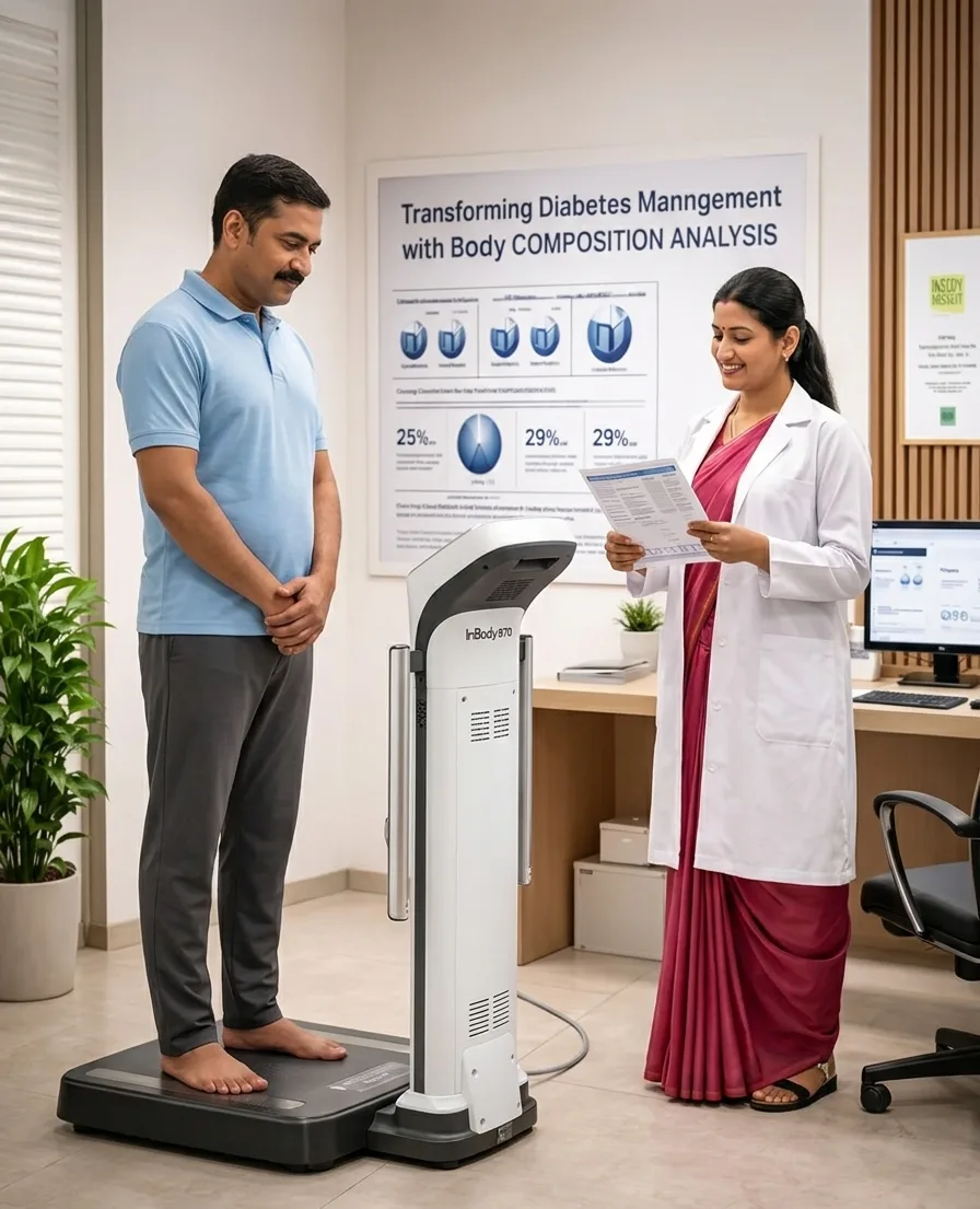 InBody provides seven diabetes-specific metrics in under 60 seconds: Visceral Fat Level (direct T2DM risk predictor), Skeletal Muscle Mass and SMI (glucose disposal capacity and sarcopenia screening), Leg Lean Mass (primary glucose uptake site), Body Fat Percentage with IAP-adjusted Indian reference values, ECW/TBW Ratio (early complication detection), and InBody Score (composite metabolic health tracker). These metrics enable personalised diabetes management targeting the specific body composition deficits driving poor glycaemic control in each patient, and confirming that pharmacological and lifestyle interventions are producing the right compositional response.