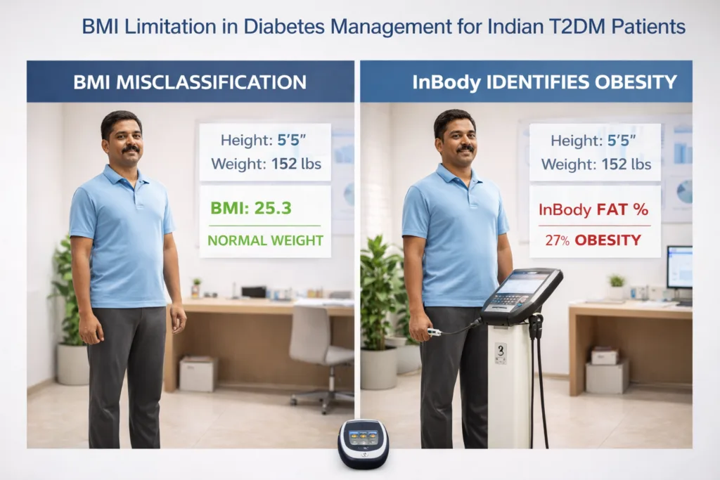 The same chart review study confirmed that the InBody 770 multi-frequency BIA used in T2DM outpatient settings was a “universal, convenient, instantaneous, non-invasive, and highly accurate” body composition assessment tool. For Indian diabetic patients specifically, IAP-adjusted body fat percentage reference values that use lower cut-offs than Western standards should be applied to ensure that the thin-fat phenotype is correctly identified.