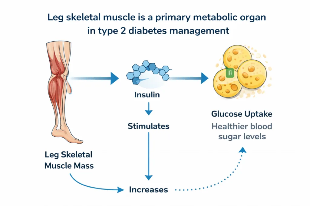 Skeletal muscle handles approximately 80% of insulin-stimulated glucose uptake. The legs alone account for approximately 60% of total skeletal muscle mass, making leg muscle the single most important metabolic tissue for blood glucose regulation in the body. Low leg lean mass is independently associated with increased insulin resistance, poor glycaemic control, and higher HbA1c.
