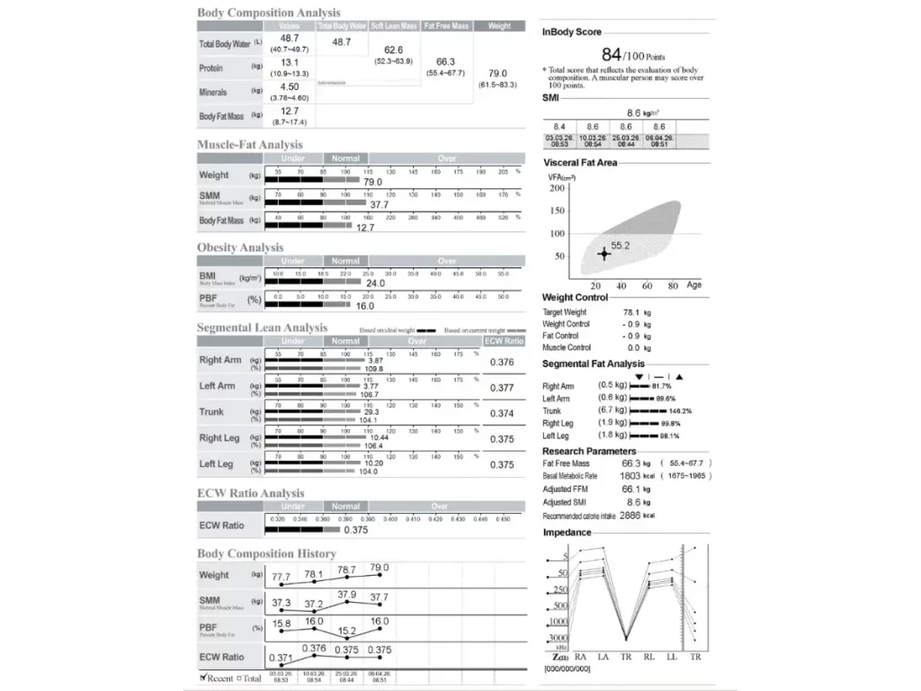 - Hydration and cellular health matter: InBody tracks intracellular and extracellular water and phase angle markers of chronic inflammation and cellular integrity that a standard scale would never detect.