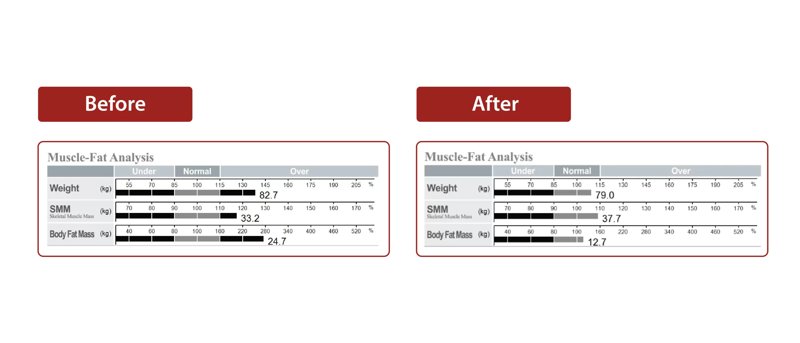 Her fatigue resolved, and her InBody Score rose from 62 to 79. Critically, her weight on the scale changed by only 1.2 kg, an imperceptible shift that would have told her doctor nothing. The simultaneous muscle gain and visceral fat reduction were only visible through body composition analysis.