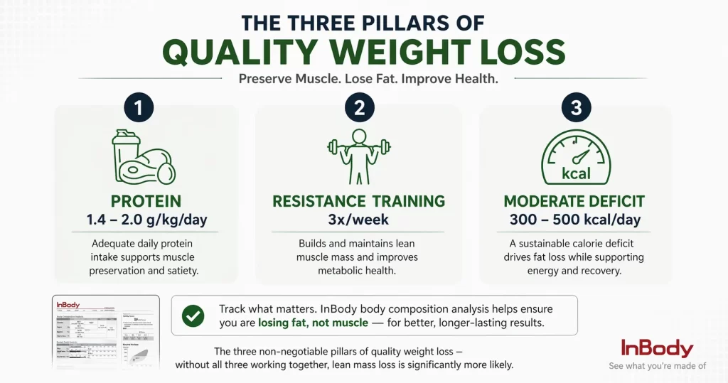 • Three pillars ensure quality weight loss: Adequate protein (1.4–2.0 g/kg/day), progressive resistance training (3+ sessions/week), and a moderate caloric deficit (0.5–1 kg/week loss) together protect lean mass while maximising fat reduction.