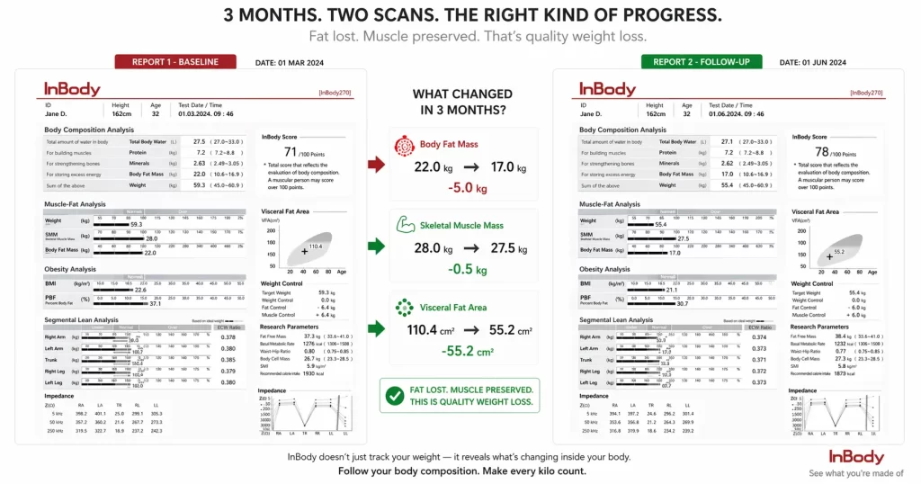 4. Body composition monitoring every 4–6 weeks: InBody scans at baseline and every 4–6 weeks provide the only objective confirmation that fat is being lost and muscle is being preserved. If data shows SMM declining, the protocol must be adjusted immediately before the metabolic consequences accumulate into something clinically significant. Without this monitoring, you are flying blind, regardless of how many kilograms the scale has moved.