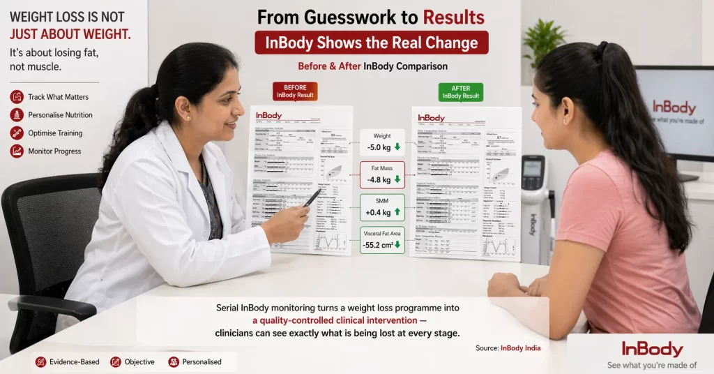 A patient doing everything right, high protein, resistance training, moderate deficit, may show no scale change for 4–6 weeks during body recomposition as fat loss is offset by muscle gain. Without InBody data showing the real improvement, this patient concludes the programme is not working and stops. Body composition monitoring is not just clinical; it is the motivational anchor that keeps patients compliant with the approaches that actually work.
