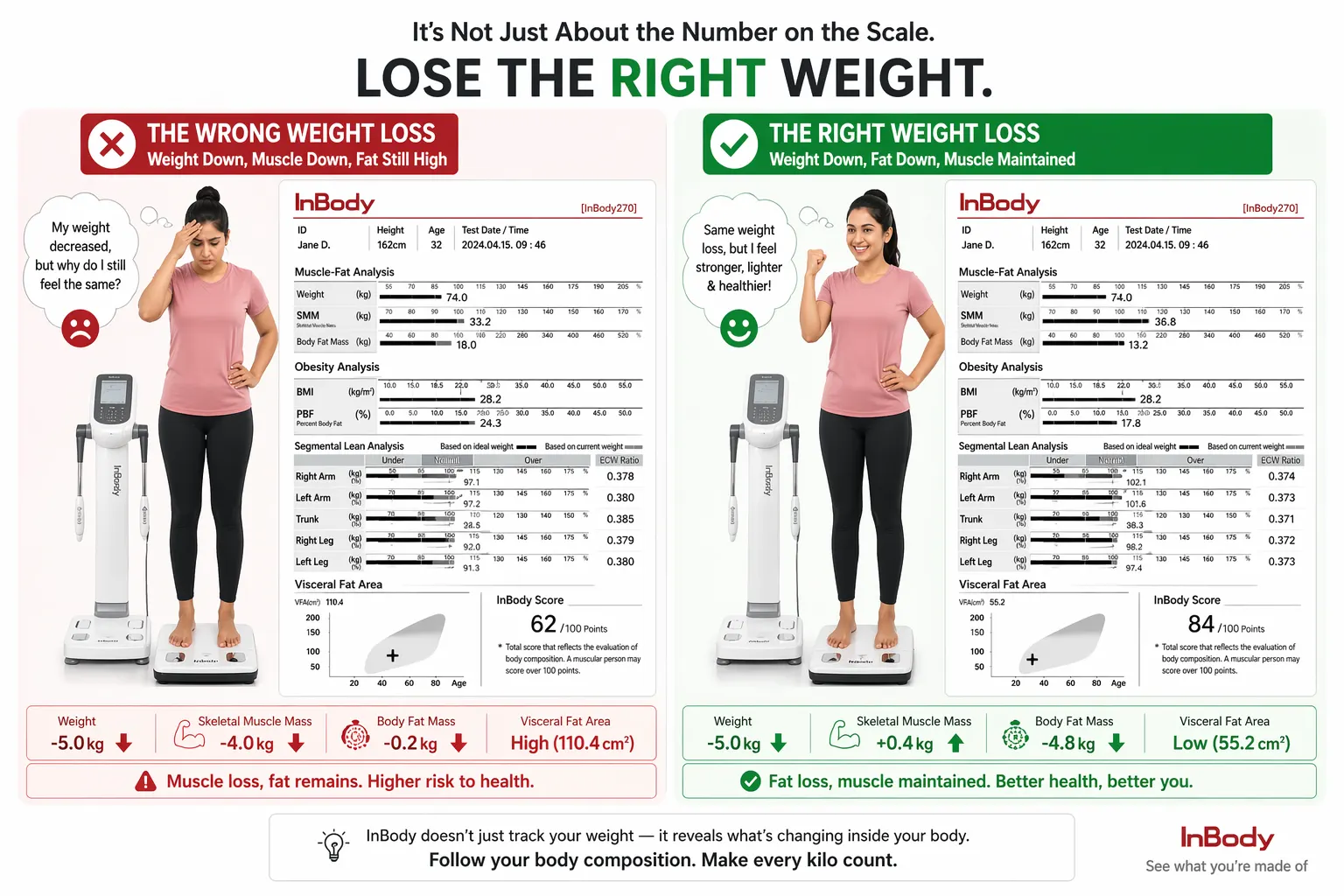 • Weight loss and fat loss are not the same: Every kilogram of weight lost is a mixture of fat, muscle, and water. The proportion determines whether your health is improving or silently worsening. The scale cannot tell you what only body composition analysis can.