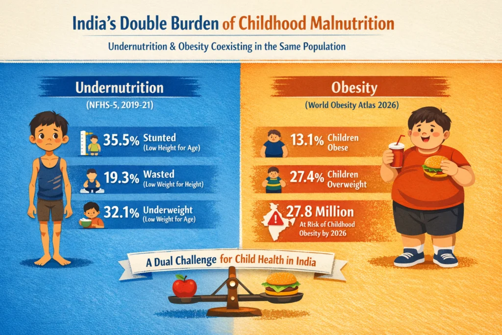 India is the only country of significant scale where a clinician can encounter moderate acute malnutrition and Grade II obesity in the same classroom, the same family, and sometimes through intergenerational paradox in different children of the same mother. UNICEF’s Child Nutrition Global Report 2025 confirmed that for the first time globally, the number of obese school-age children has surpassed the number of underweight children.
