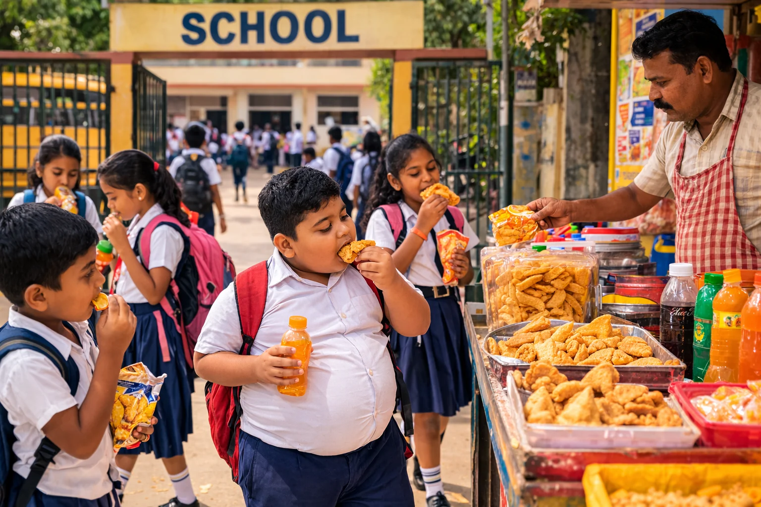 Studies in metropolitan and tier-2 cities document widespread clustering of ultra-processed snack vendors, sugary beverage stalls, and fast-food outlets within 50 metres of school gates. Children aged 10–14 are particularly vulnerable, with pocket money and reduced parental supervision enabling independent food purchases several times per day.