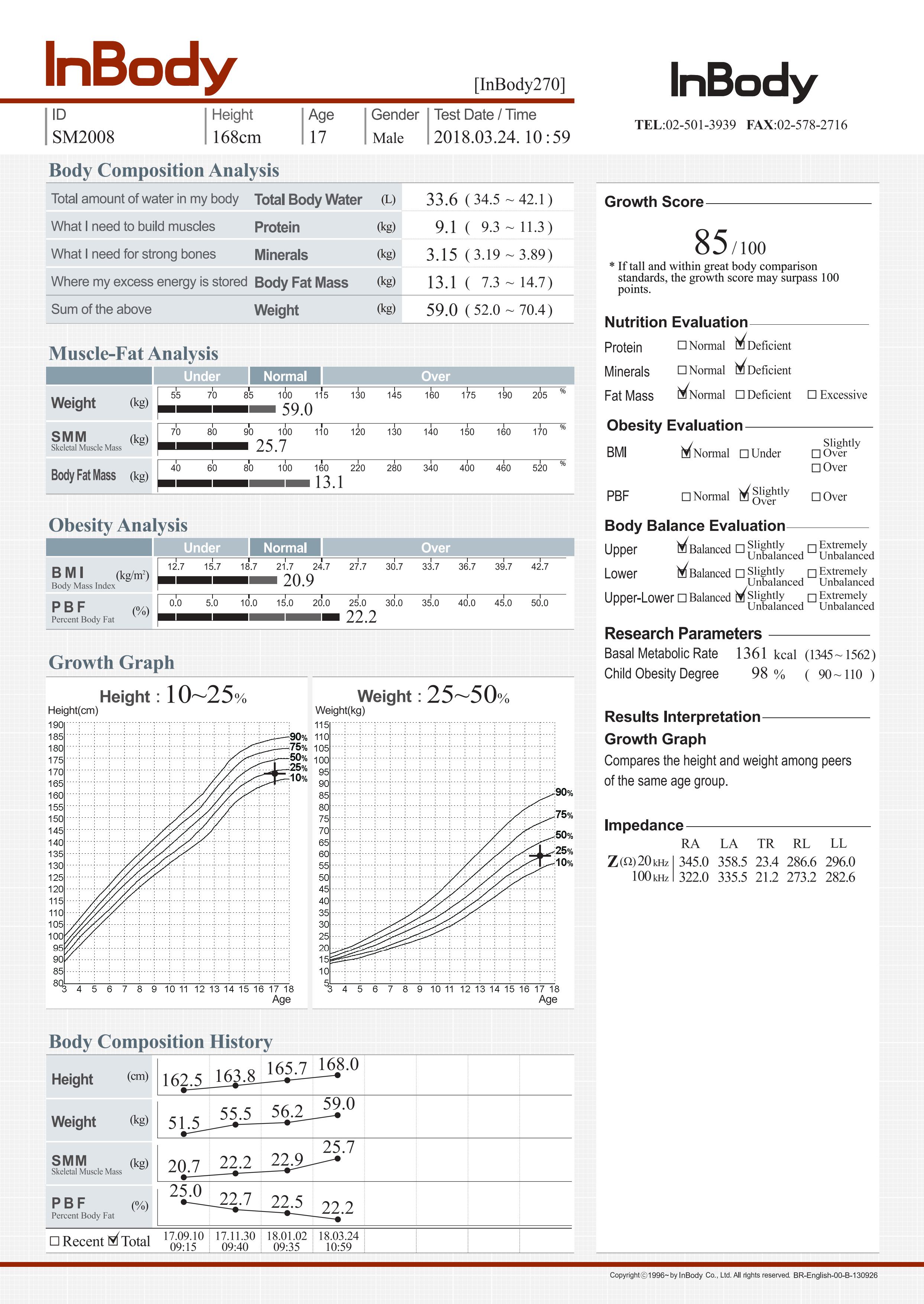 This InBody children result sheet highlights the importance of looking beyond weight alone when assessing obesity. Although the 17-year-old male weighs 59 kg with a BMI of 20.9 (within the normal range), the detailed analysis shows how muscle mass, fat mass, and body balance contribute to overall health. His body fat percentage (22.2%) is slightly on the higher side but still within acceptable limits, while muscle mass has steadily improved over time. The growth score of 85/100 reflects good development, but his height is on the lower percentile compared to peers, reminding us that growth patterns vary individually. Also the growth graph implies that the height is below average (10-25th), while weight is average (25-50th), showing a slight imbalance in growth.