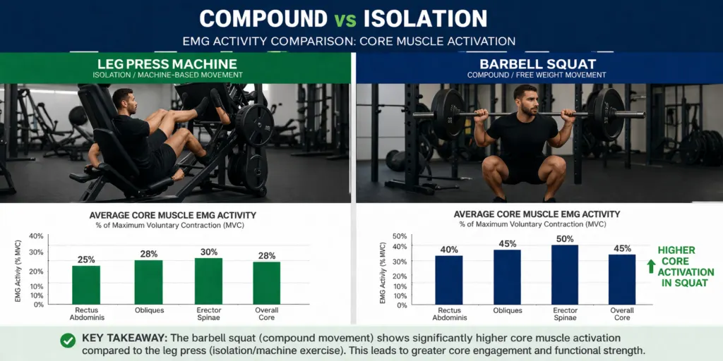 Compound free-weight movements, such as squats, deadlifts, Romanian deadlifts, overhead press, and barbell rows, require the entire core to co-activate as a stabilising system. Studies on core electromyography consistently show that free-weight compound lifts activate significantly more trunk muscle fibres than isolated machine equivalents. A gym routine built entirely on machines will produce localised hypertrophy while leaving the functional core, the muscles responsible for spinal stability, posture, and glucose disposal, undertrained and progressively weakened.