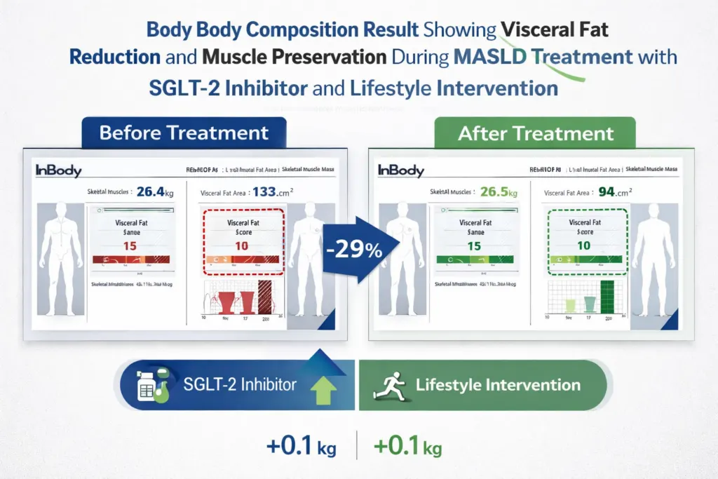 Every one of these interventions produces body composition changes that can be tracked with InBody, and these body composition changes are detectable at 12 weeks, long before repeat elastography or biopsy can confirm histological response. When a patient on semaglutide loses 8 kg over 16 weeks, InBody reveals whether that weight loss is predominantly visceral fat reduction (a true metabolic win) or includes significant skeletal muscle loss (a concerning signal that requires protein intake adjustment and resistance training). Liver ultrasound alone cannot tell you either.