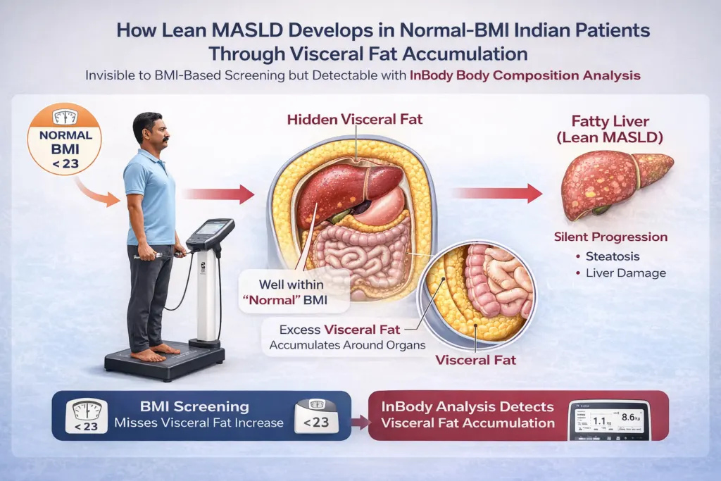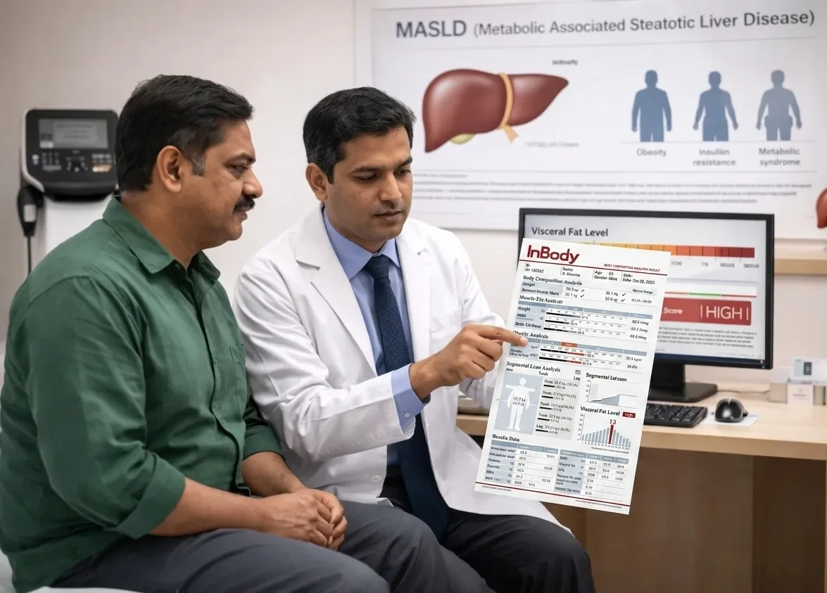 Research consistently shows that MASLD is increasing in India, even among individuals with normal BMI, due to central obesity and genetic factors. Visceral fat, not total body weight, is the primary driver of hepatic fat accumulation in Indian patients. A patient with a BMI of 22.5 and a Visceral Fat Level of 11 measured by InBody has a clinically significant MASLD risk that their BMI completely conceals. This is the metabolic reality that standard assessment tools are missing in millions of Indian patients every year. Learn more about why BMI misses what body composition reveals.