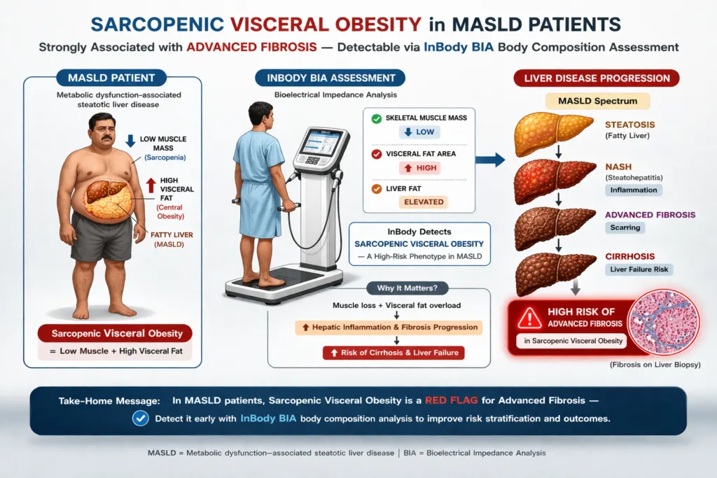 Sarcopenic visceral obesity (SVO), the concurrent presence of low skeletal muscle mass and excess visceral fat, has emerged as the highest-risk body composition phenotype in MASLD. A landmark 2025 PMC cross-sectional study of 334 adults with MASLD confirmed that SVO was independently associated with advanced liver fibrosis, elevated cardiovascular risk, and significantly worse metabolic markers than either sarcopenia or visceral obesity alone. Sarcopenia was assessed in this study by bioelectrical impedance analysis exactly the technology InBody provides.