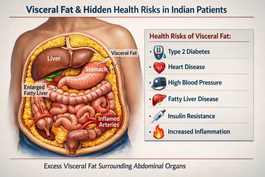 Your weighing scale cannot see it. Your BMI cannot find it. But visceral fat is silently working against your health right now. Unlike the fat you can see or pinch, visceral fat sits deep inside your abdominal cavity, wrapped around your liver, pancreas, and intestines. It is metabolically active. It releases harmful hormones. And for Indians especially, it accumulates at BMI levels that most doctors would call perfectly healthy.