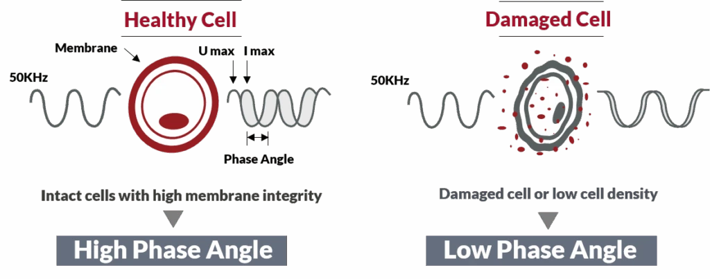 - Phase Angle (PhA): Reflects cell membrane integrity and body cell mass.