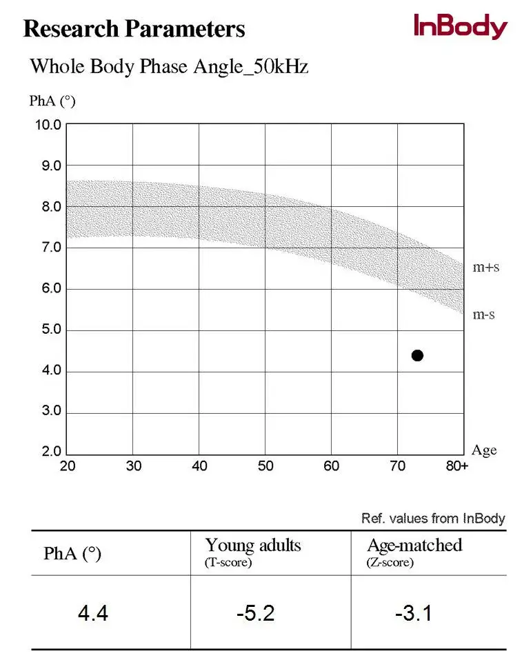 - The PhA is much lower than healthy young adults (T-score: -5.2).