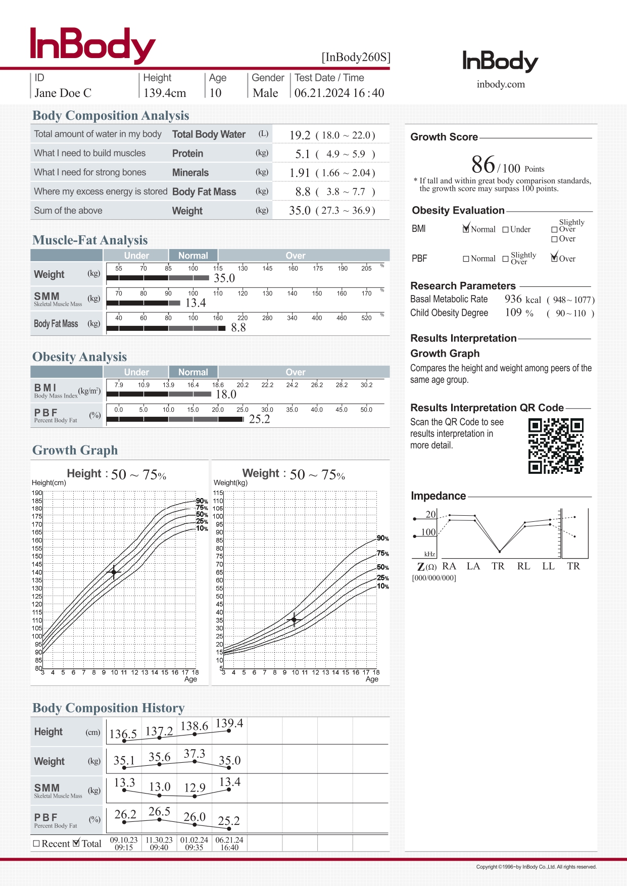 - InBody Result Sheet for Children allows you to see the growth and pyhsical development at a glance, provides a standard curve for children's growth so that children can easily check their growth status.