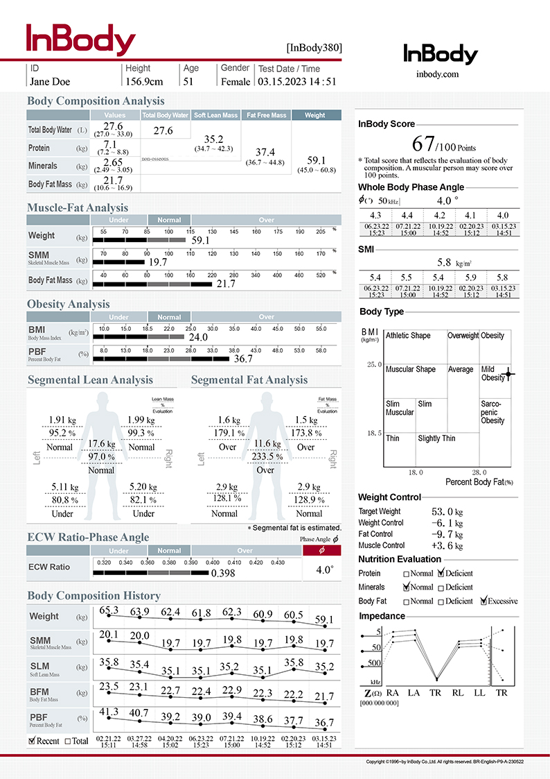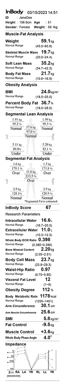 - Body Fat-Lean Body Mass Control, Basal Metabolic Rate, Impedance Graph, Visceral Fat Level, Segmental Fat Analysis, Skeletal Muscle Index, InBody Score, Arm Circumference