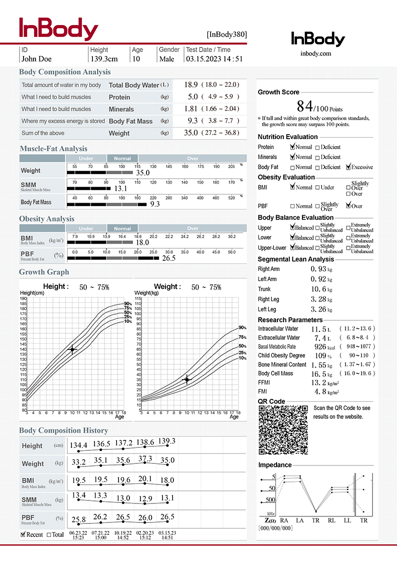 - InBody Result Sheet for Children, which allows you to see the growth and physical development at a glance, provides a standard curve for children's growth so that children can easily check their growth status.